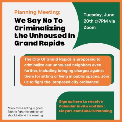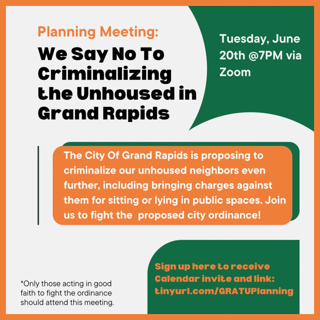 Fortunately, the Grand Rapids Area Tenant Union, along with other potential groups in Grand Rapids, will be organizing an effort to counter the Chamber of Commerce/City of Grand Rapids plans to criminalize the unhoused. Go to their Facebook page to find upcoming actions and information resources to oppose the criminalization of the unhoused.
