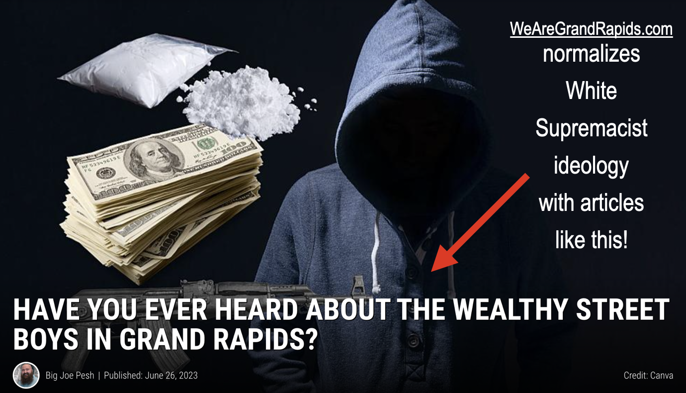 Both of these dynamics are deeply problematic. The story normalizes White Supremacy, since it presents mostly images of Black people who fit all the stereotypes about that most white people believe when it comes to drugs and Black people. Even asking the question, Have You Ever Heard about the Wealthy Street Boys in Grand Rapids?, reflects a White Supremacist ideology, since the writer had no intention of discussing the larger historical context about the very existence of a Black gang in Grand Rapids.