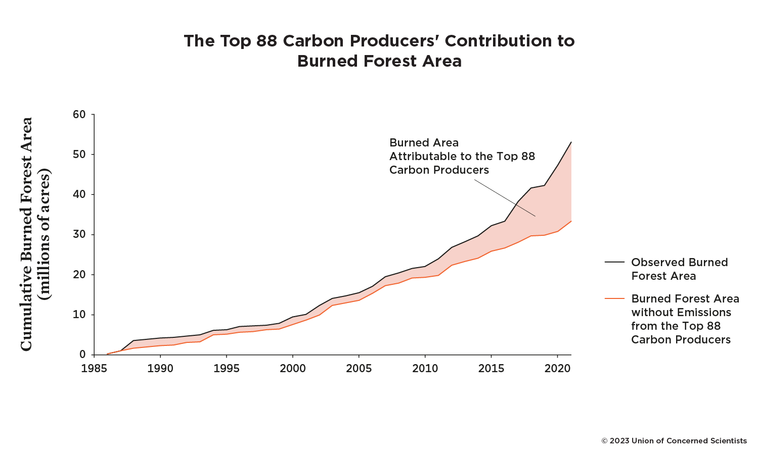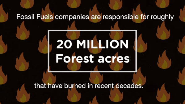 “19.8 million acres burned—37% of the total area scorched by forest fires in the western United States and southwestern Canada since 1986—can be attributed to heat-trapping emissions traced to the world’s 88 largest fossil fuel producers and cement manufacturers. Emissions from these companies also contributed to nearly half of the observed increase in conditions that raise the risk of large, severe forest fires across the region since 1901, the study found. The findings provide new data that can advance efforts to hold companies accountable for past, present, and future climate damages and risks.”