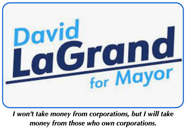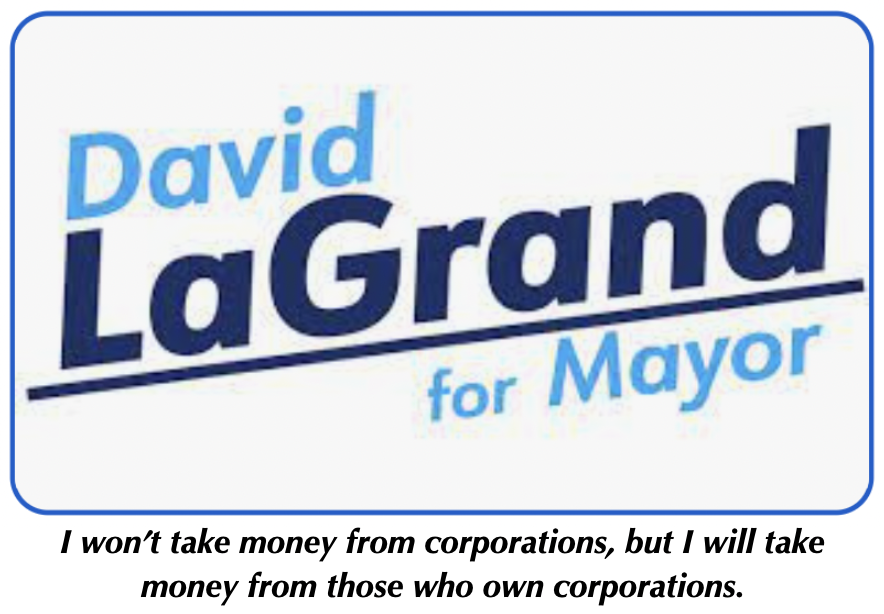 Now, on LaGrand’s campaign website, he states, “I do not and will not accept money from corporations.” However, it is clear that from his first reporting of campaign finances as a candidate for Mayor of Grand Rapids, that LaGrand will take money from people who own corporations.