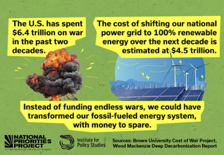 - Over-investment in the military comes at the high cost of under-investing in other needs, including climate. For decades, the U.S. has invested in military adventurism and prioritized military threats above all over threats to human life. Compared to the $6.4 trillion spent on war in the past two decades, the cost of shifting the U.S. power grid to 100% renewable is an estimate $4.5 trillion. The bloated U.S. war economy presents an opportunity to redirect significant military resources, including money, infrastructure, and people, toward implementing solutions to climate change.