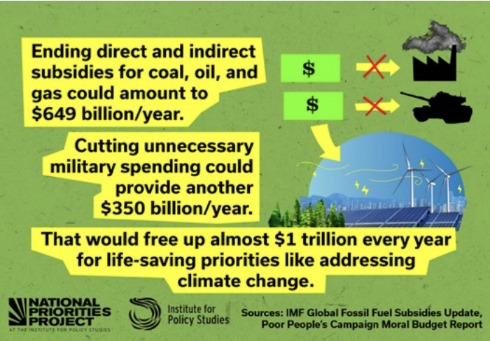 - Workers need a way out. The fossil fuel and military sectors mirror each other in the way that workers frequently end up funneled into lethal work due to limited options. We need a Just Transition for workers and communities in both sectors. In order to rapidly transition to a green economy, we must fund millions of jobs in the green economy. Funding the green economy instead of a bloated military budget would be a net job creator; for the same level of spending, clean energy and infrastructure create over 40% more jobs and energy efficiency retrofits create nearly twice the level of job creation.