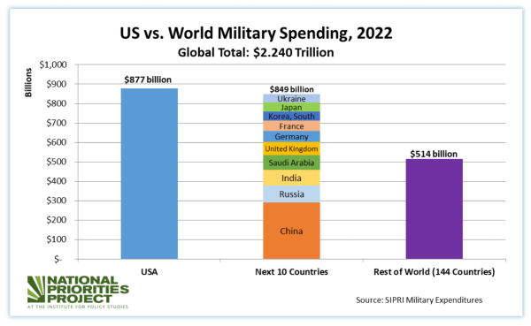 The 2023 US Military Budget is $877 Billion, and according to the National Priorities Project, the US Military Budget is larger than the 10 next largest military budgets combined, which includes China, Russia, India, Saudi Arabia, the UK, Germany, France, South Korea, Japan and the Ukraine, seen in the graph here below.