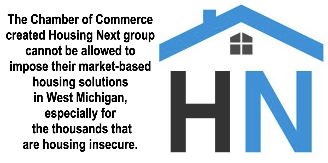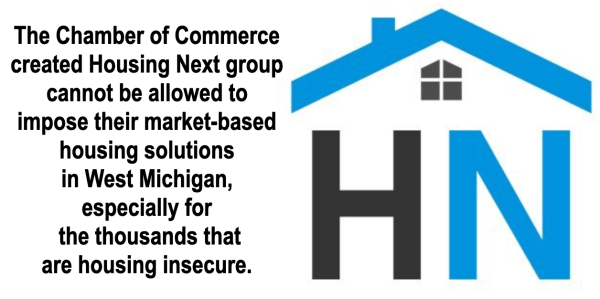 In addition, we need to recognize that Housing Next is an entity that was essentially created by the Chamber of Commerce, primarily as a way to insert themselves into the housing discussion and to influence housing policy. Recently, Housing Next was able to bamboozle the Michigan State Housing Development Authority (MSHDA), to allow them to be the point entity for West Michigan to hold community meetings around housing and to work to re-direct state money to subsidize housing projects for the near future. Also, if you read the Housing at all Price Points section, it states, “Thankfully, we have made significant progress to rise to this challenge, but we still need to accelerate our efforts to create desirable, walkable and amenity-rich housing opportunities.” Notice that the word affordable is nowhere in that statement, plus all of the “resources” they list are market-based or public-private solution.