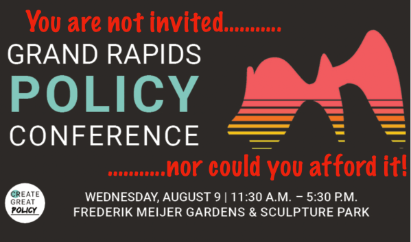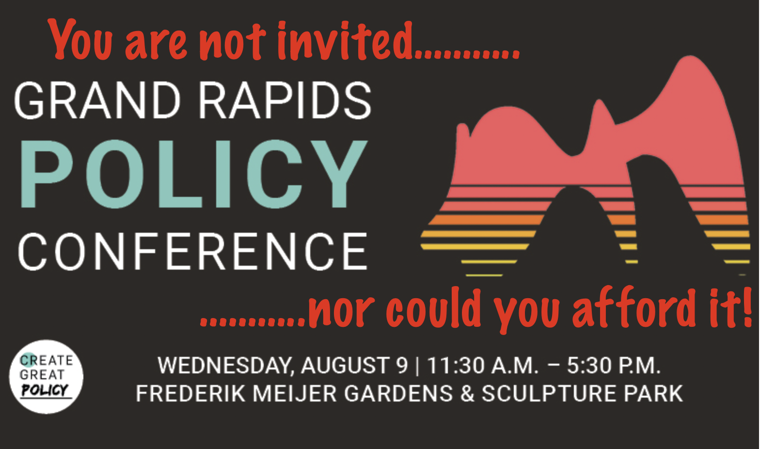 Lastly, it is worth noting that the Grand Rapids Chamber of Commerce will be discussing this vision – so-called transformational projects, housing and increasing cops and private security guards – at an afternoon conference being held at Frederick Meijer Gardens this Wednesday, August 9th, from 11:30am – 5:30pm. The conference will include business leaders, community leaders, and local thought leaders. Thought leaders? Why do those who have power over others always use such stupid language? Are they suggesting that they are leaders who think or are thoughtful? Please, they only think about what benefits their interests. Oh, and if you want to attend this “Policy Conference”, it will cost you $250 to attend, assuming you aren’t a Chamber member. GRIID sent a request to attend as media, but have yet to receive a response.