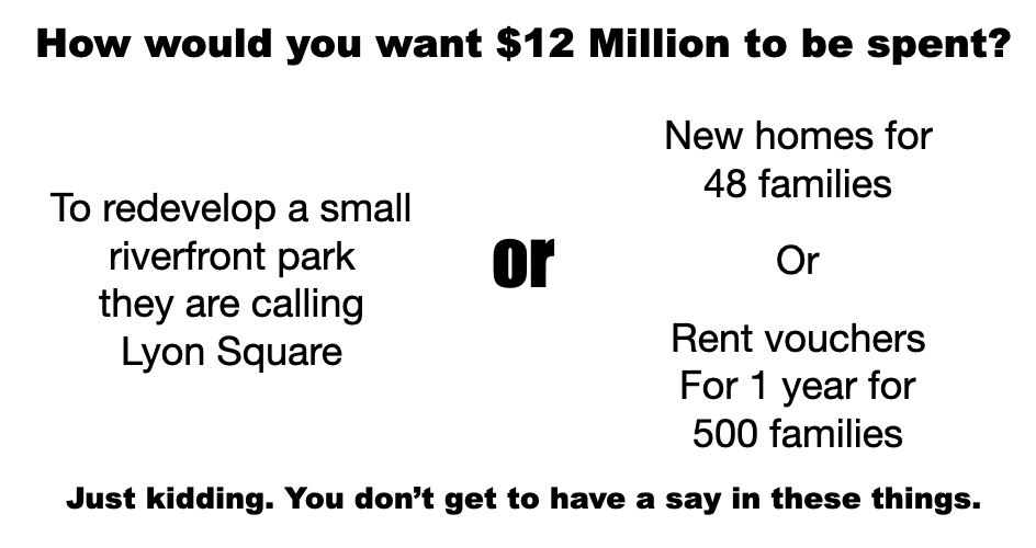Therefore, either 48 families could have their new homes paid for with the $12 Million that will be spent on Lyon Square or 500 families could have their rent paid for during a 12 month period. If given a chance to vote on this, how do you think most families would vote on the $12 Million?