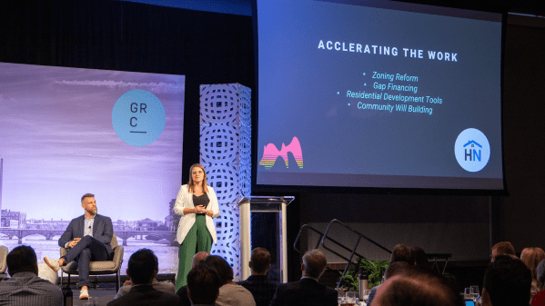 This next picture, we see people with the Grand Rapids Chamber of Commerce created group, Housing Next, speaking during the policy conference. Note the kinds of things that are listed that they want to do. All of those items are a reflection of their commitment to solving the housing crisis through the market. What we don’t see listed are challenging the power of financial institutions that have made the cost of housing so unaffordable, elevating tenants and their fight against exploitation by landlords and property management companies, the issue of how much money the real estate industry and landlord associations contribute to political candidates, or the fact that most companies don’t pay workers livable wages, which is why so many can’t afford to buy a home or pay rent.