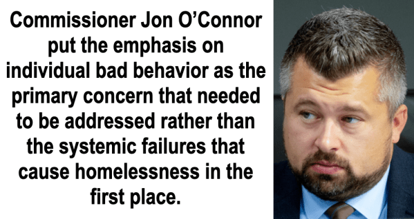 This point is further solidified by O’Connor who references the Crossroads Bible Church and the resources people can access there. While the resources are useful, they do not address the larger, systemic problems of the housing crisis. Therefore, it seems clear to this writer that Commissioner O’Connor either fails to recognize that there are root causes of the current housing crisis, or that he just doesn’t give a shit.