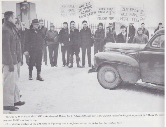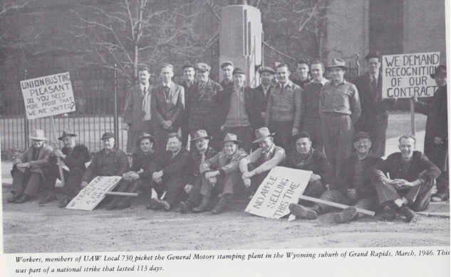 Despite the no-strike pledge, union membership in the US grew from 7.2 million in 1940 to 14.5 million at the end of WWII. The strikes began almost the moment that the bombs stopped dropping on Japan. In September 1945, 43,000 petroleum workers and 200,000 coal workers went on strike. In October, 44,000 lumber workers, 70,000 teamsters, and 40,000 machinists joined them. Then in November 1945, the UAW called its first major strike against GM since the company was unionized in 1937. Nearly a quarter of a million men walked out. Grand Rapids saw the same dynamic: workers who experienced years of frustrations during the no-strike pledge of WWII began to challenge the capitalist class by engaging in walkouts and strikes. In 1946, workers at the UAW Local 730 at the GM plant in Wyoming, Michigan were part of the national UAW strike that lasted for 113 days. The UAW striking workers were fighting for better wages, pensions, and improved working conditions, all of which were denied them during the no-strike pledge of WWII.