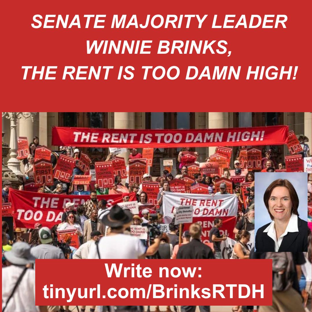 Locally, the Grand Rapids Area Tenant Union is encouraging people to sign on to an Action Alert that would pressure Senator Brinks, who is the current Senate Majority Leader, to embrace the four demands of the statewide Rent is Too Damn High coalition. Just go to this link to sign a digital letter to Senator Brinks, then share it with your social media circles.