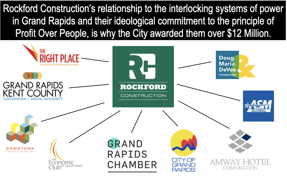 The fact that Grand Rapids will award a total pf $10,321,660 with a total amount not-to-exceed $12,462,996 to Rockford Construction is completely expected, considering the company’s relationship to the interlocking systems of power in Grand Rapids and their deep commitment to the principle of Profits Over People.