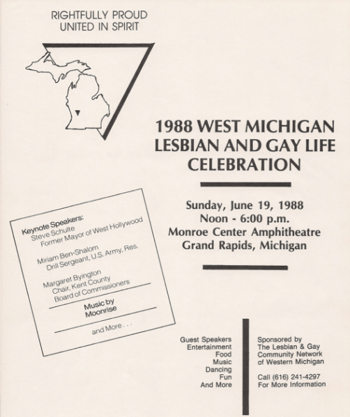 The first Pride Celebration was held in June of 1988, although the Mayor of Grand Rapids would not support the event, nor provide a declaration for the event, even though Mayor Helmholt had written proclamation for the following events the same year – Michigan Beverage News Week, Family Sexuality Education Month, Polish Heritage Month, National Roofing Week and Bozo Show Day. Mayor Helmholt did deny another group a proclamation, a neo-Nazi group that was hosting an event in Grand Rapids that same year.