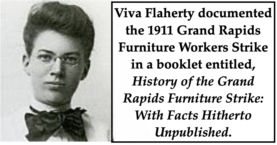 Furniture workers, on the other hand, had a very different view of life working in those factories. One important source that reflected the worker’s perspective was a booklet called, History of the Grand Rapids Furniture Strike: With Facts Hitherto Unpublished.14 This document was created by Viva Flaherty, a secretary at Fountain Street Church and a known Socialist. Flaherty documented the 1911 strike because she believed that the “people of Grand Rapids are awakened and enlightened and they can be trusted with the whole truth.”