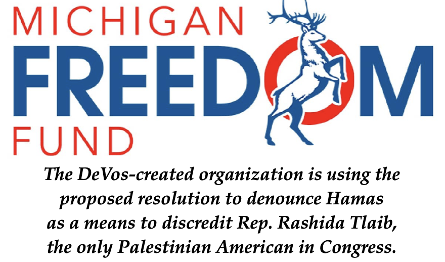 On Thursday, the DeVos-created and funded organization, the Michigan Freedom Fund (MFF), posted an article entitled, Michigan House Democrats Join Tlaib in Refusal To Condemn Hamas.