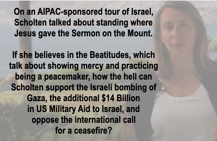 On October 17, I posted an article entitled, Rep. Scholten endorses Israeli War Crimes in Gaza, which focused on her endorsement of increased US military funding for Israel, while Israel was carpet bombing Gaza.