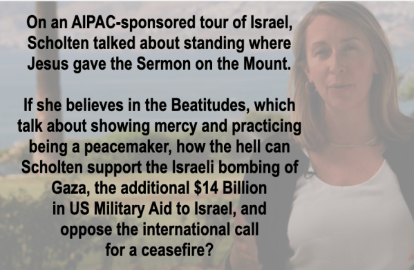 The question I have for Rep. Scholten and her supporters is, if you are a believer in the Beatitudes, then how do you justify the decades long US support for the Israeli occupation of Palestinian land and the decades-long US military funding of Israeli, funding that results in the murder of countless civilians, like what we are currently seeing in Gaza?