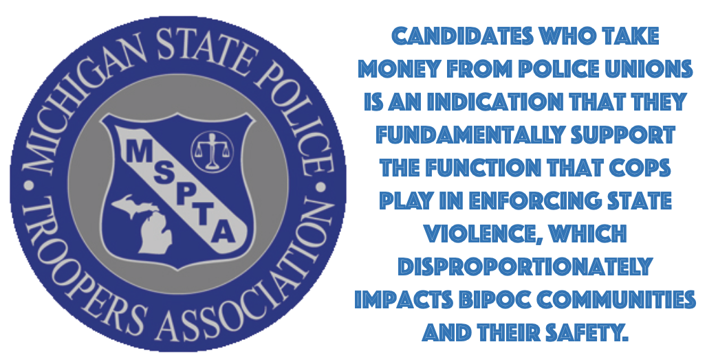 Police Departments have come under increased scrutiny in recent years, in part because of the high profile cases of cops killing Black people like Breonna Taylor, George Floyd and Patrick Lyoya. With the increased number of police murders of BIPOC people, there are more people confronting politicians who are accepting money from police unions. BIPOC-led movements are calling on all people who are able to vote, to consider not supporting candidates who take money from police unions. Candidates who take money from police unions is an indication that they fundamentally support the function that cops play in enforcing state violence, which disproportionately impacts BIPOC communities and their safety.