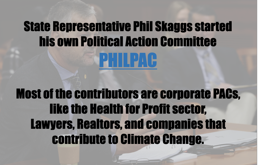As you can see, of the 15 different contributions, 12 of them came from Business/Corporate PACs, two from organized labor (carpenters and teachers) and one from a government PAC. I don’t include the Troopers PAC as labor, since cops are a whole other kind of political animal. Thus, it would seem that the newly formed PHILPAC, by State Representative Phil Skaggs, relies heavily on corporate money, Realtors, the for profit health industry and lawyers. Politicians and candidates who will be taking this money, will no doubt be beholden to the interests of their paymasters.