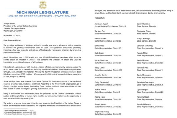 Last Wednesday, 25 members of the Michigan State Legislature signed a letter that was sent to President Biden calling for a cease fire and an “enduring peace.”