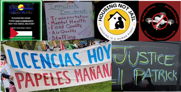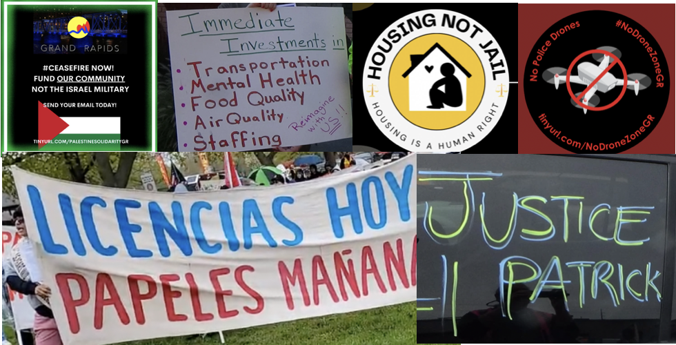 Lastly, after the October 7 Hamas attack in Israel, the Israeli military initiated a brutal assault on Gaza that as of today had killed roughly 20,000 Palestinians. Several groups have organized numerous actions since October, such as a campaign to get the City of Grand Rapids to call for a ceasefire and to pressure members of Congress to stop sending so much money to Israel, since the needs in this community are so great. The first action to pressure the City of Grand Rapids was in mid-November, with a follow up action in mid-December.