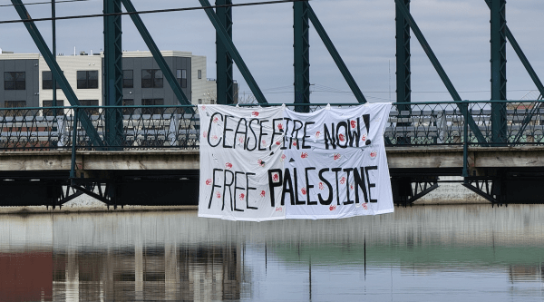 Free Palestine is the message on recent banner drops in Grand Rapids