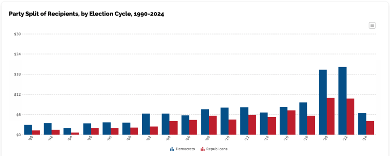 The last sentence in Sen. Cardin’s comment underscores what is at issue here…….the fact that most Democratic politicians do not want to be seen as critical of Israel. The unconditional support for Israel in the federal government is so powerful, that politicians want to avoid even the appearance of being critical of Israel. This fact is reflected in the data below, provided by Open Secrets, which shows that since 1990, the Democrats have always been the larger recipient of Pro-Israel PACs.