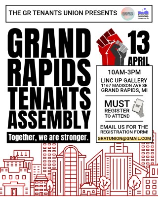 Lastly, as a counter to the false solution narrative of groups like Housing Next, the Grand Rapids Area Tenant Union will be hosting a Tenant Assembly on April 13th in order to not only inform tenants of their rights, but to build power amongst tenants as a means to challenge the power of landlords and property management companies. Check out the flyer included here and check the Facebook page of the Grand Rapids Area Tenant Union to find out how to register for the Tenant Assembly. You can also send an Email to the GR Area Tenant Union to request a registration form, at gratunion@gmail.com.