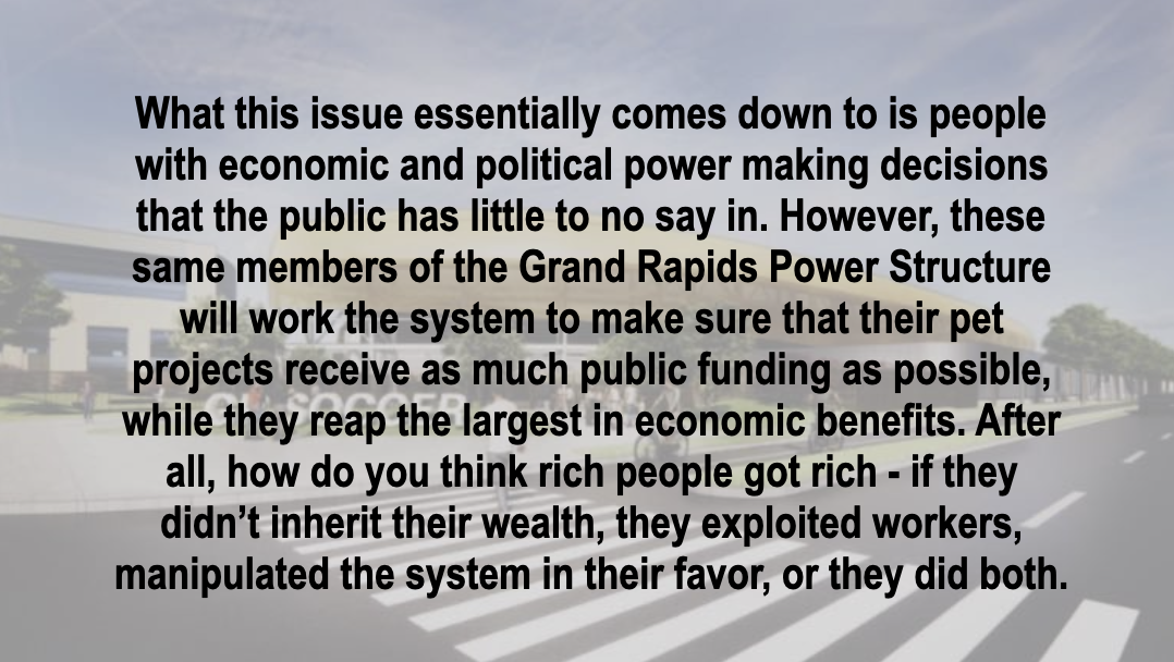 What this issue essentially comes down to is people with economic and political power making decisions that the public has little to no say in. However, these same members of the Grand Rapids Power Structure will work the system to make sure that their pet projects receive as much public funding as possible, while they reap the largest in economic benefits. After all, how do you think rich people got rich – if they didn’t inherit their wealth, they exploited workers, manipulated the system in their favor, or they did both.
