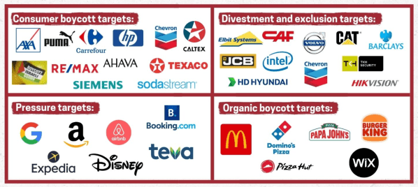 The BDS campaign also focuses on targeted boycotts instead of un-targeted. Un-targeted boycotts are usually longer list of companies to boycott, as opposed to choosing few targets that can often have a larger impact. The targets that the BDS campaign has focused on are companies like Caterpillar, Hewlett Packard (HP), Chevron, RE/MAX, ect. In the graphic above you can see some of the targeted boycott campaigns, some of which are for institutions to divest from. If you are part of a faith community, a university, a corporation or even a labor union, you could chose to divest from companies that are profiting off of the Israeli occupation and Israeli Apartheid. However, there are other boycotts, such as consumer boycotts or pressure targets that people can organize campaigns against directly, both by not purchasing products, but also by doing larger public awareness campaigns or direct actions against companies complicit in the Israeli occupation and Israeli genocide.