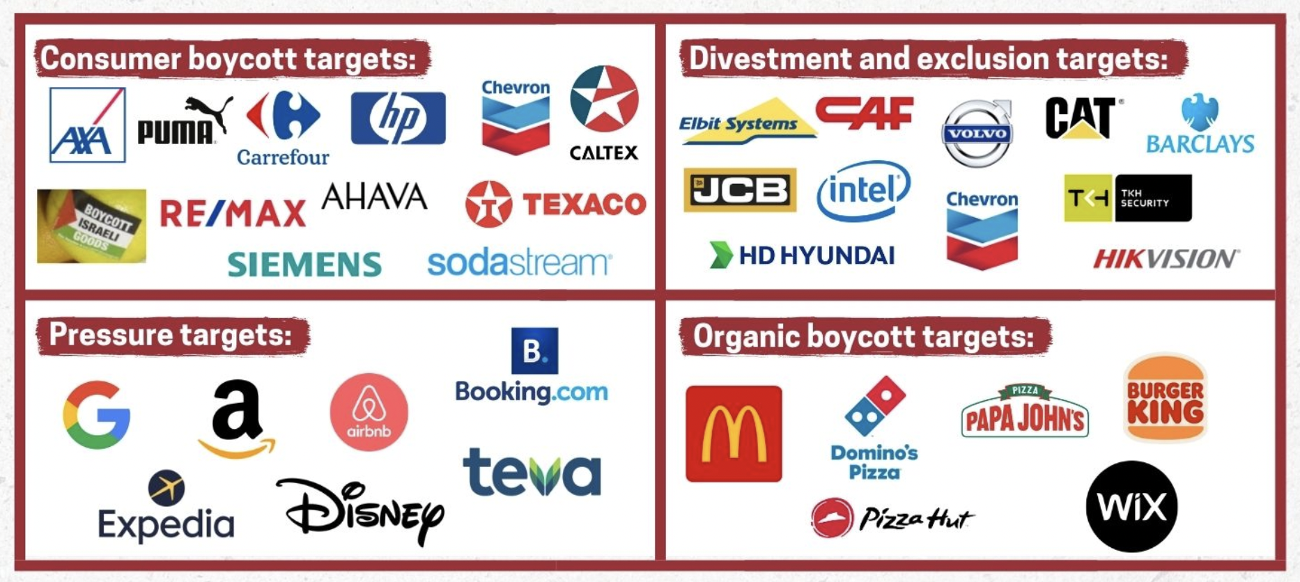 The BDS campaign also focuses on targeted boycotts instead of un-targeted. Un-targeted boycotts are usually longer list of companies to boycott, as opposed to choosing few targets that can often have a larger impact. The targets that the BDS campaign has focused on are companies like Caterpillar, Hewlett Packard (HP), Chevron, RE/MAX, ect. In the graphic above you can see some of the targeted boycott campaigns, some of which are for institutions to divest from. If you are part of a faith community, a university, a corporation or even a labor union, you could chose to divest from companies that are profiting off of the Israeli occupation and Israeli Apartheid. However, there are other boycotts, such as consumer boycotts or pressure targets that people can organize campaigns against directly, both by not purchasing products, but also by doing larger public awareness campaigns or direct actions against companies complicit in the Israeli occupation and Israeli genocide.