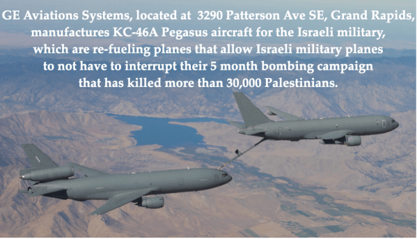 The bottom line is that there is yet another military contractor in the Grand Rapids area that is assisting in the manufacturing of the KC-46A Pegasus planes, which provides in air refueling for Israeli military planes that have been carpet bombing Gaza since early October of 2023. And while the contract at the GE Aviations Systems plant on Patterson Ave. is for weapons, but it is for military equipment that is being used to support the Israeli military’s genocidal campaign be wage in Gaza at this very moment.
