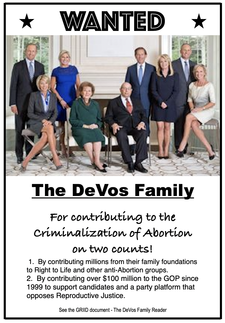 Additionally, there are thousands of religious people in West Michigan that make regular contributions to Michigan Right to Life. Several members of the West Michigan elite have collectively contributed millions of dollars to anti-abortion groups and other “family values” organization that want to keep cisgender men in a dominant role in society, which means they do not want women and other genders to have bodily autonomy. In Russ Bellant’s book, The Religious Right in Michigan Politics, he cites the DeVos family, Peter Cook, the Prince family, the Van Andel family, and the DeWitt family all as major funders of the anti-abortion movement. Many of these same families continue to make significant financial contributions to anti-abortions groups like Right to Life.