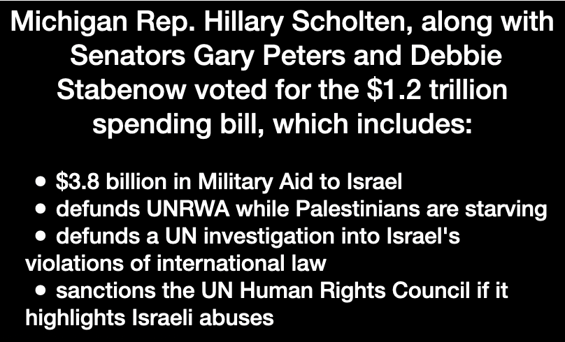 Interestingly enough, in her weekly newsletter, Rep. Scholten said nothing about what was in the $1.2 trillion spending bill and only complained about Republicans did. Rep. Scholten said nothing about voting for another massive US military budget, and most importantly, she said nothing about US military aid to Israel and the other three points listed above. It seems that Rep.m Scholten is ok with the Israeli genocide against the Palestinians, especially since she has been voting for it and justifying it since she went on her AIPAC-funded trip last August.