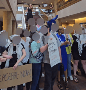 Inside the venue, a dozen community members chanted for a free Palestine and an end to the occupation, temporarily blocking access to the main stairwell and disrupting the registration process. In response, Kent County Democrats reacted with physical aggression, pushing and grabbing peaceful protestors. One young community member had her hijab pulled, while another organizer was shoved against a wall and pushed into a heavy glass door. The violence perpetrated by institutionalized Democrats onto young peaceful activists is abhorrent and telling of the underlying values system that keeps them funding the genocide in Gaza.