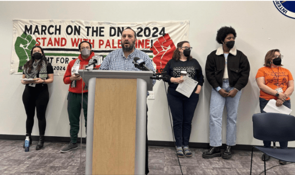 Representatives of members of the Coalition to March on the DNC speaking at a press conference in Chicago on April 13, 2024