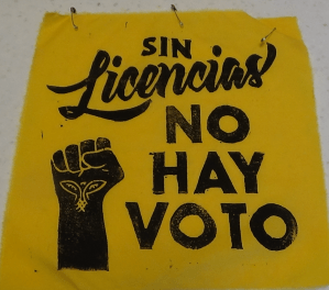All of this was very familiar, since Movimiento Cosecha has utilized very similar tactics in previous protests at the State Capital. What was noticeably different about yesterday’s action was what people were chanting. People were chanting the phrase, No Licencias, No voto!, meaning if you (elected state officials) don’t pass the driver’s licenses bill, we will not be voting for you! Movimiento Cosecha organizers had made up enough patches for everyone to pin on their shirts, with some in Spanish and others in English. In fact, one Cosecha organizer has shared with me that they will likely follow the model of the uncommitted vote in the upcoming August Primary Election, where people will withhold their vote for State Representatives if they do not pass the Driver’s Licenses bill. As a Cosecha organizer said, “we are leveraging out vote to make demands of politicians. If they want us to vote for them, then they need to give us what we have been demanding for years.”