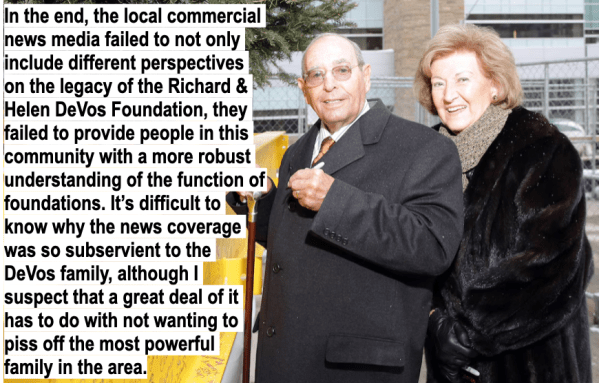 In the end, the local commercial news media failed to not only include different perspectives on the legacy of the Richard & Helen DeVos Foundation, they failed to provide people in this community with a more robust understanding of the function of foundations. It’s difficult to know why the news coverage was so subservient to the DeVos family, although I suspect that a great deal of it has to do with not wanting to piss off the most powerful family in the area. In addition, after methodically monitoring the local commercial Neds media for the past 30 years, I would say that the simplistic coverage of the Richard & Helen DeVos Foundation coming to an end has to do with the fact that the local commercial news media – both editors and journalists – both have internalized the values of the rich and powerful, thus deferring to reporting on them as celebrities and saints.