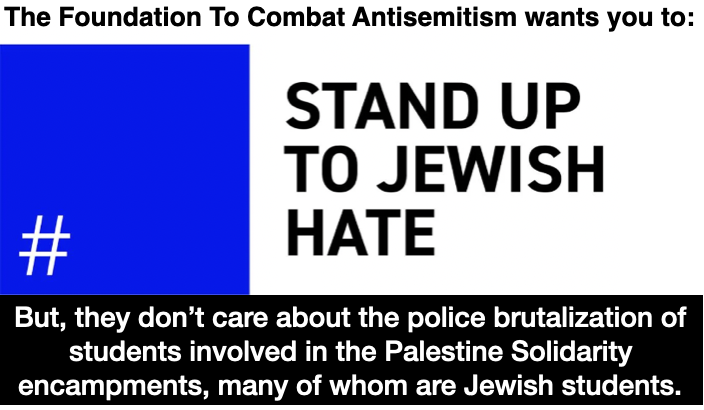 Instead of producing a misleading video about how student protesters should behave, maybe the Foundation To Combat Antisemitism should make a video about the state violence directed at Jewish students who are organizing and participating in the Palestine Solidarity encampments at campuses across the country.