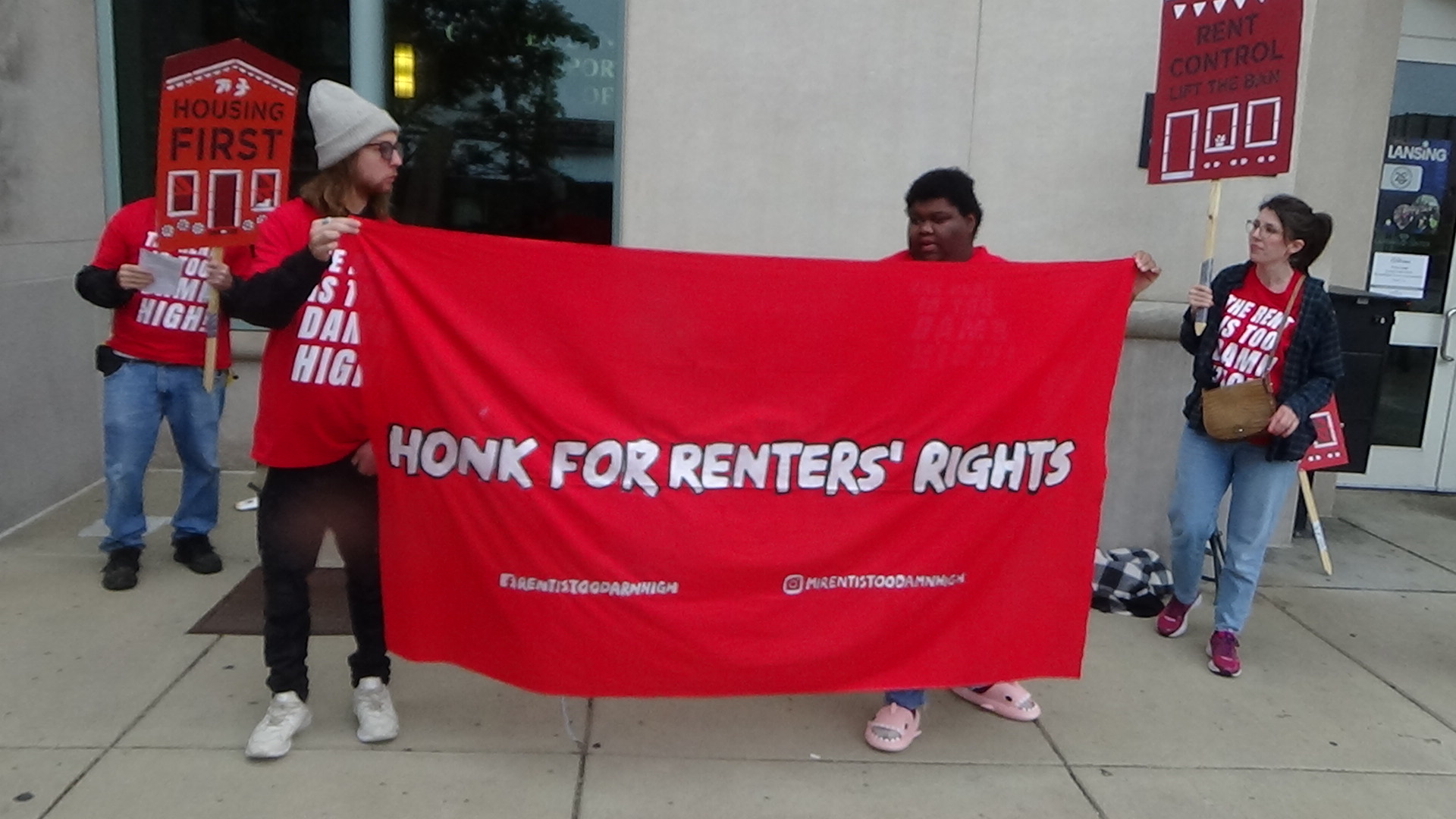 The Rent is Too Damn High picket involved lots of chanting and some marching in from of the Lansing Center. There were a few banners and most of the picketers held up signs demanding Social Housing, Renters Rights, Housing First and Rent Control, which also happens to be the four main demands of the statewide coalition.