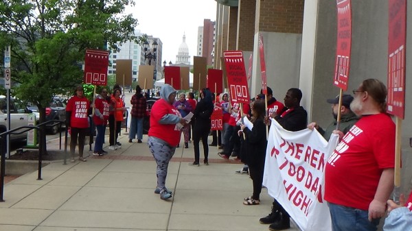 On Tuesday, about 75 people held a picket out in front of the Lansing Center, just east of downtown Lansing, where people were attending a conference hosted by the Michigan State Housing Development Authority (MSHDA).
