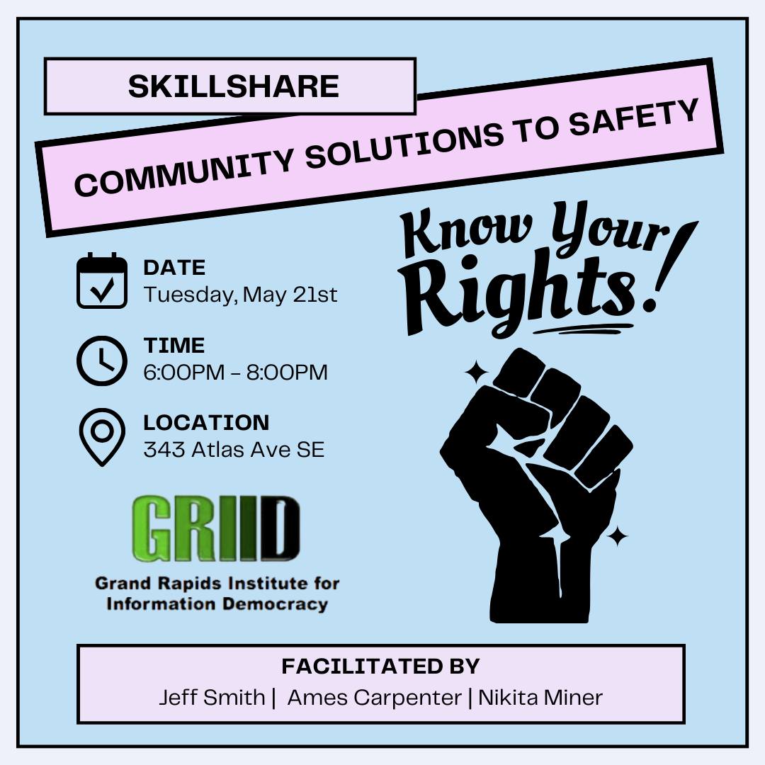 The police have a long history of targeting 2SLGBTQIA+ communities, especially where they intersect with BIPOC and disabled communities. Join us for a workshop to talk about your rights when interacting with the police. We’ll work through scenarios, as well as various options for community safety without police involvement. Presented by the Grand Rapids Institute for Information Democracy and the Grand Rapids Pride Center. Facilitated by Jeff Smith, Ames Carpenter, and Nikita Miner.