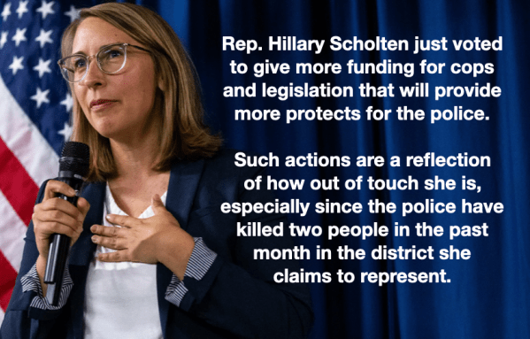 Today, I want to point out that Rep. Scholten also has voted for and supports policies and funding for more police and to further protect cops from any real accountability.
