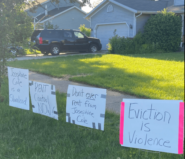 Infuriated, the tenant asked GRATU to organize another protest a week later. Not as many people were able to attend a second protest at the landlord’s home, they did make yard signs and left them in the front lawn with messages like Eviction is Violence, Rent Control Now, Josephine Cole is a Slumlord and Don’t Ever Rent from Josephine Cole.