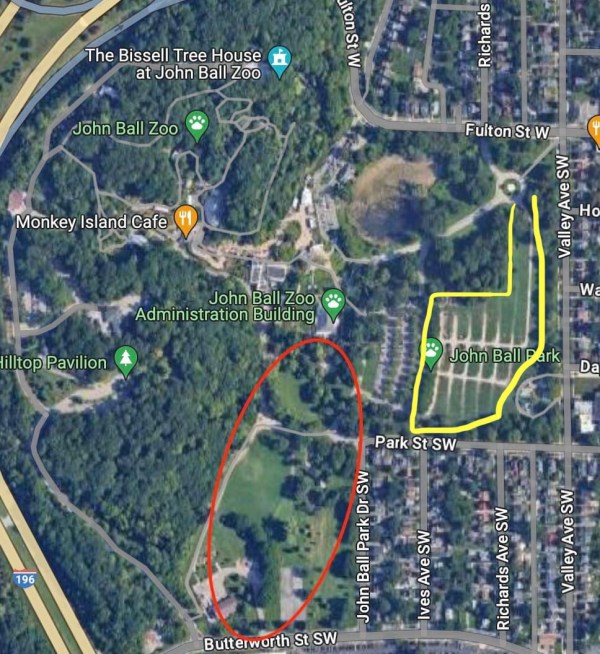 Map Description: Here is a map of John Ball Park. The area circled in red is where the zoo will pave. The area marked in yellow is where the zoo has taken over most of our main playing field by laying down a gravel parking lot, a road, and planting trees to border the parking lot and road.