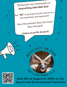 I rolled out our boycott on social media in April. The boycott is being amplified on FB, IG and X; search for “BoycottJBZoo” or #boycottJBZoo. We will have a protest on 6/27/24 at John Ball Park, 5:00 p.m. – 6:15 p.m. to amplify our boycott. Bring signs! We are meeting on West Fulton on the sidewalk near one of their entrances by the wooden JBZoo sign.