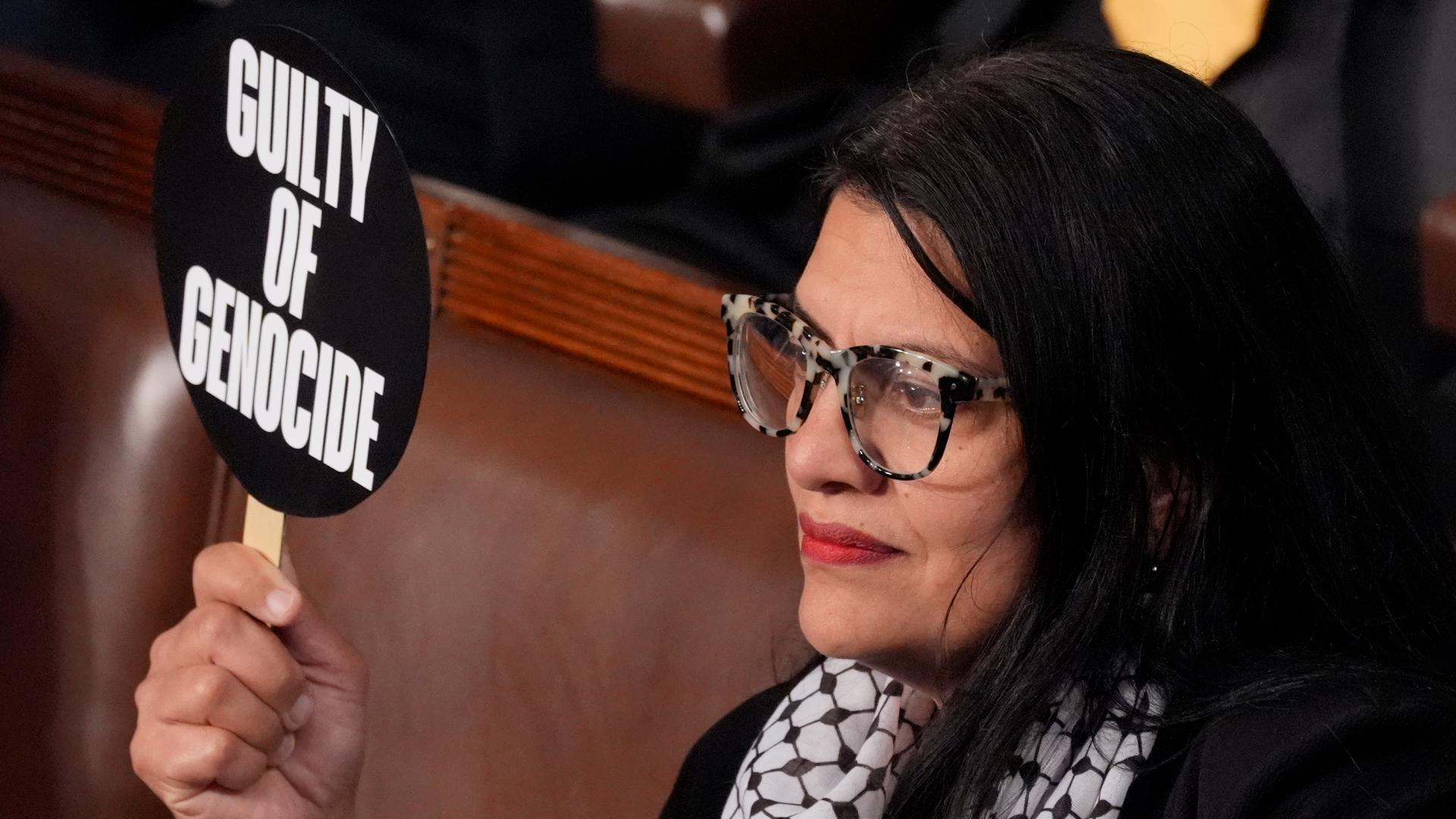 Imagine used is Rep. Talib holding sign up during Netanyahu’s speech. On the other said it said War Criminal!