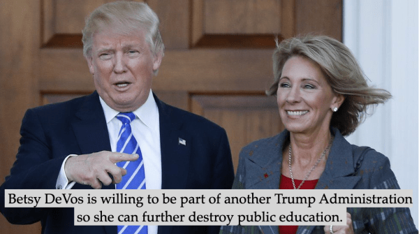 The New Republic reported – as did many other news outlets – that DeVos said she would return to the post of Secretary of Education, but with one condition, she would like to serve with the “goal of phasing out the Department of Education as we tried to do through the budgetary process in the first administration.”