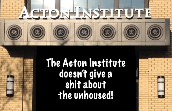 In fact, the very pro-Capitalism message of the Acton Institute, is arguably a major contributing factor in the increased number of those who are unhoused and the millions of people who are housing insecure. You can’t be in favor of gentrification, the commodification of housing or the corporatization of the housing and rental market and then say that unhoused people don’t have a right to housing. Maybe it is time we organize an encampment in front of the Acton Institute building and draw attention to their brutally cold support of Capitalism!