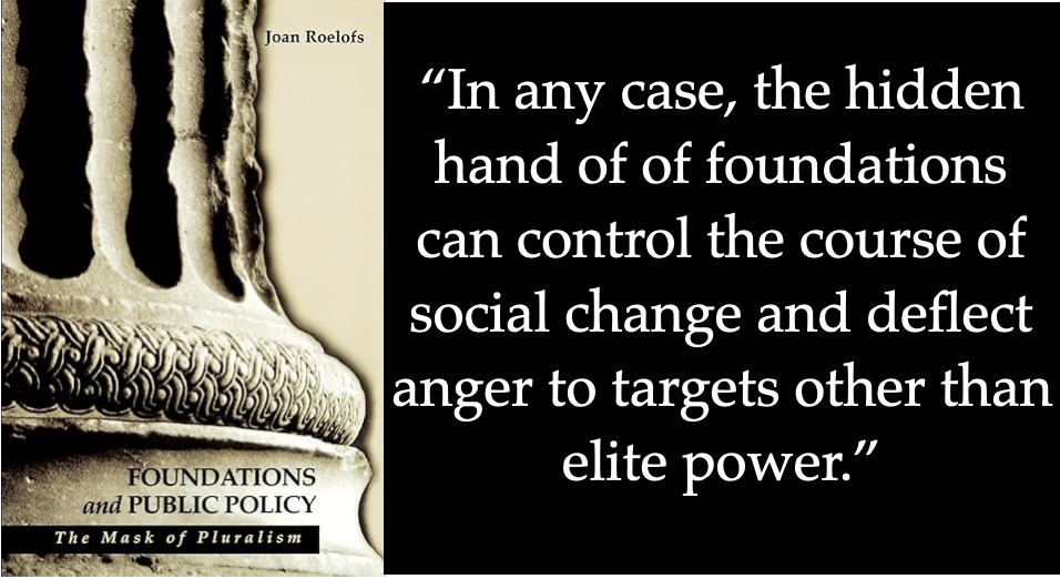 Foundations are a way for members of the Capitalist Class, which made their wealth by exploiting workers, to hide some of their wealth from taxation, only to then turn around and use foundation funds to undermine social movements and generate positive PR for themselves.