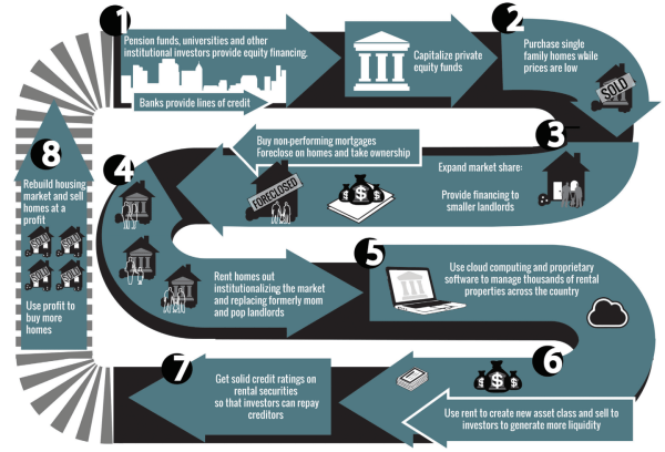 In 2014, the Right to the City published a reported entitled, The Rise of the Corporate Landlord, which further investigated and analyzed the corporate investor control of more and more rental properties in the US. The infographic above is from that report.